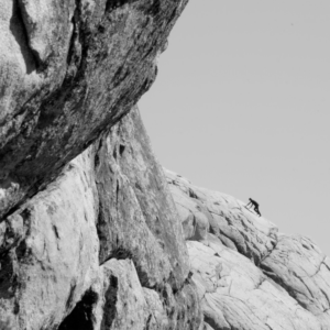 In a striking otherworldly terrain, a rock climber undergoes a poetic transformation when a mythological winged creature descends.